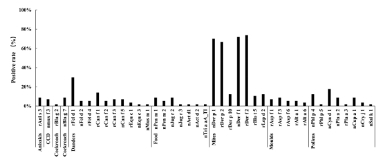 結果:在ISAC中,nDer f 1(71.9%)、rDer f 2(73.7%)、nDer p 1(70.2%)和rDer p 2(66.7%)的致敏率最高,而rDer p 10和其他貯藏螨組分的陽性率僅為10%。rFel d 1和rCan f 1分別在29.8%和14.0%的樣本中呈陽性。其他動物皮屑的陽性率均低于7.0%。對花粉組分的致敏主要為nCyn d 1(17.5%)和nPhl p 4(12.3%),4例nPhl p 4、nCyn a 2陽性、 nCyn d 1(CCD)陽性,均合并哮喘和鼻炎。對霉菌(rAsp f 3)、蟑螂(nBla g 7)和單線蟲(rAni s 3)的敏感性相同,為8.8%。93.0%的患者對一種以上的組分敏感,其中有一半以上(57.9%)對五種或五種以上的組分呈陽性。合并哮喘和鼻炎患者(AA + AR)比僅哮喘患者(AA)對更多的組分敏感。AA + AR患者的nPhl p 4陽性率顯著高于僅AA患者(χ2 = 4.31,P = 0.038)。