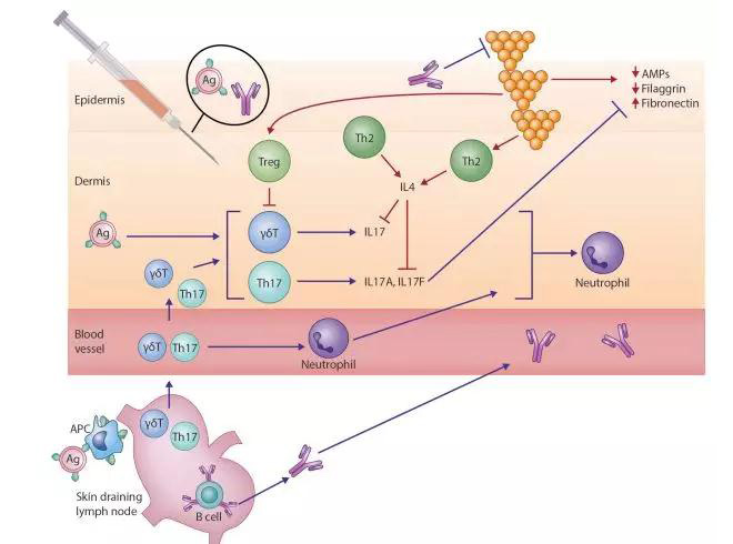 在過去的十年中,我們對AD這一復(fù)雜的異質(zhì)性疾病的病因的認(rèn)識有了很大的發(fā)展?!坝赏舛鴥?nèi)”和“由內(nèi)而外”疾病過程的兩分法觀點已經(jīng)被這樣一種認(rèn)識所取代,即AD的特征是受損的皮膚屏障和異常的局部和系統(tǒng)免疫反應(yīng)的相互作用。盡管Th2偏離炎癥長期以來被認(rèn)為是疾病表達(dá)的中心,但TH22和TH17介導(dǎo)的炎癥現(xiàn)在也在不同程度上影響不同年齡和種族的患者。金黃色葡萄球菌現(xiàn)在也被認(rèn)為是AD患者的另一個關(guān)鍵致病因素,包括它在放大Th2介導(dǎo)反應(yīng)中的關(guān)鍵作用。S金葡菌利用了遺傳性功能缺失突變導(dǎo)致的聚絲蛋白表達(dá)減少,并通過TH2極化獲得,以及繼發(fā)于皮膚失調(diào)的抗菌肽水平降低。這些因素導(dǎo)致了特應(yīng)性皮膚的高定植率。一旦建立,S金葡菌釋放多種毒力因子,包括絲氨酸蛋白酶、外毒素和溶血素,如酚溶性調(diào)節(jié)蛋白。這些都加劇了潛在的屏障功能障礙,并使內(nèi)源性促炎因子路徑失調(diào)持續(xù)下去。 S金葡菌細(xì)胞壁成分,包括肽聚糖,放大TH2-驅(qū)動應(yīng)答,導(dǎo)致增加粘附分子的表達(dá)(纖連蛋白和纖維蛋白原),減少抗菌肽的表達(dá)(人類β-防御素2和抗菌肽)和屏障蛋白(絲聚合蛋白和兜甲蛋白)。