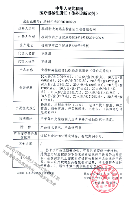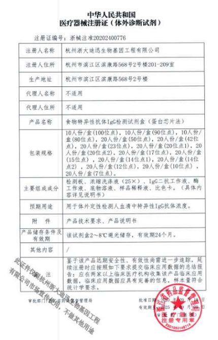 2020年9月浙大迪迅自主研發(fā)的兩個(gè)新產(chǎn)品100項(xiàng)食物特異性抗體IgG檢測試劑盒(蛋白芯片法)、食物特異性抗體IgG4檢測試劑盒(蛋白芯片法)正式取得浙江省藥品監(jiān)督管理局頒發(fā)的二類醫(yī)療器械注冊證,其中100項(xiàng)食物特異性抗體IgG4檢測試劑盒(蛋白芯片法),是國內(nèi)首家獲得醫(yī)療器械注冊證的產(chǎn)品,填補(bǔ)國內(nèi)空白,同時(shí)榮獲浙江省創(chuàng)新醫(yī)療器械。
